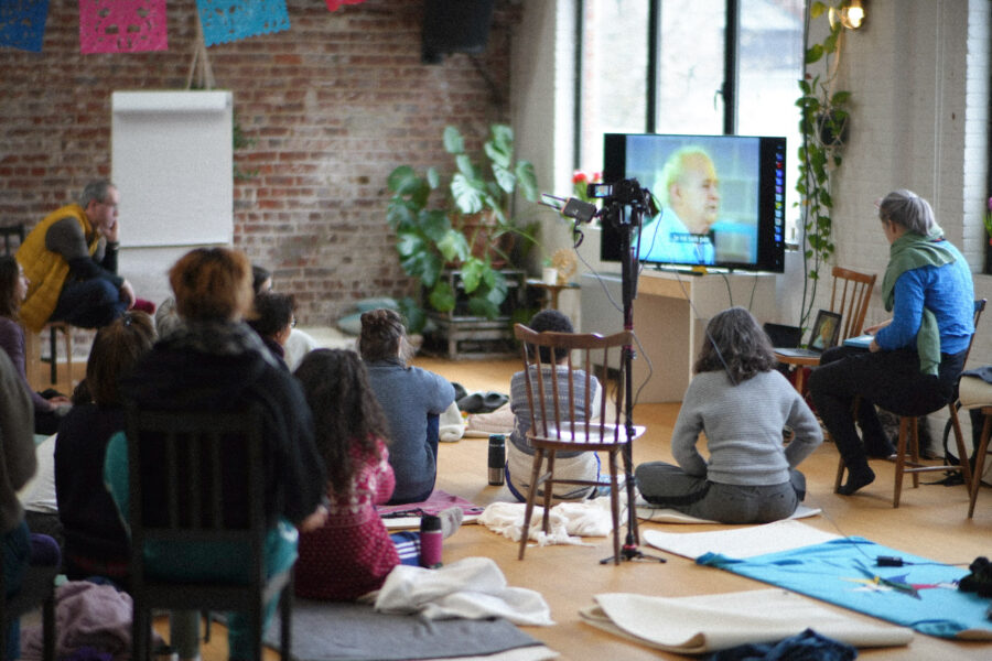 The venue features a library, floor mats, tables for bodywork, a kitchen, changing rooms, and bicycle parking, serving a wide range of needs.